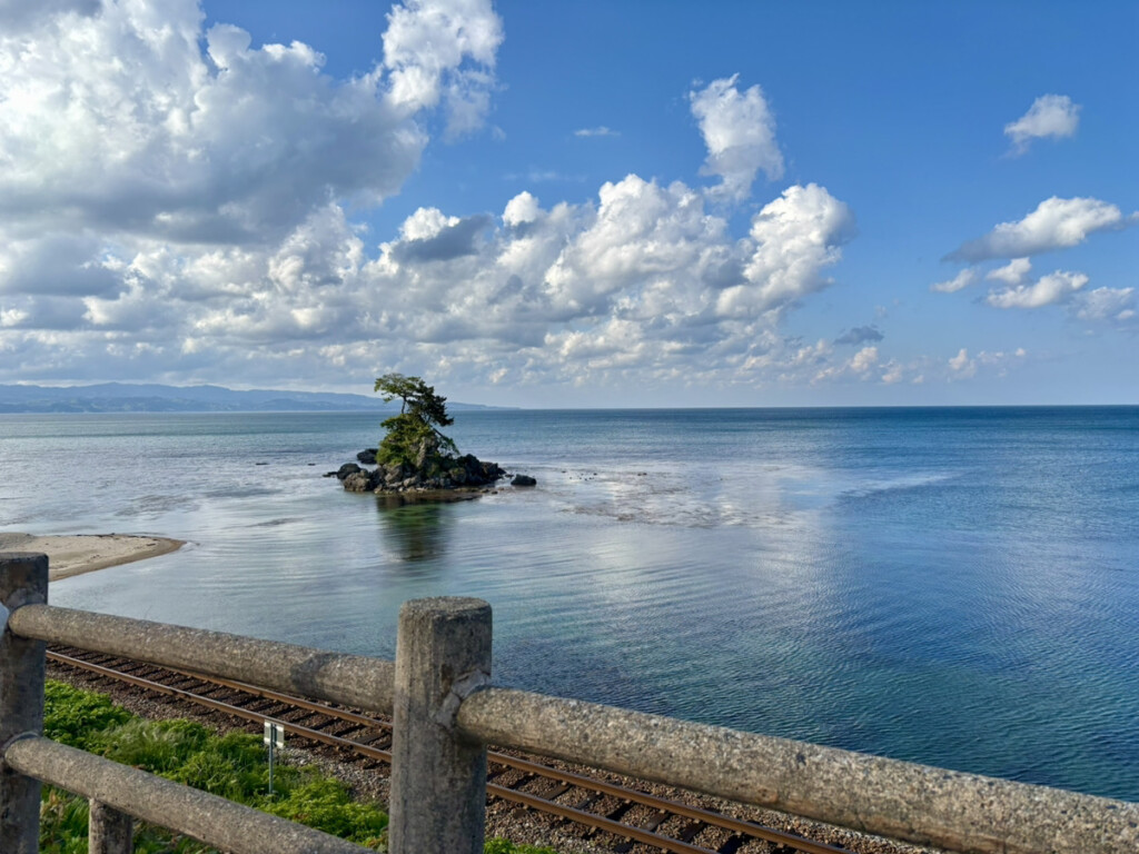 この日は残念ながら立山連峰を望むことはできませんでしたが、富山湾と女岩と線路が合わさった眺めは、趣を感じさせる美しいものでした。