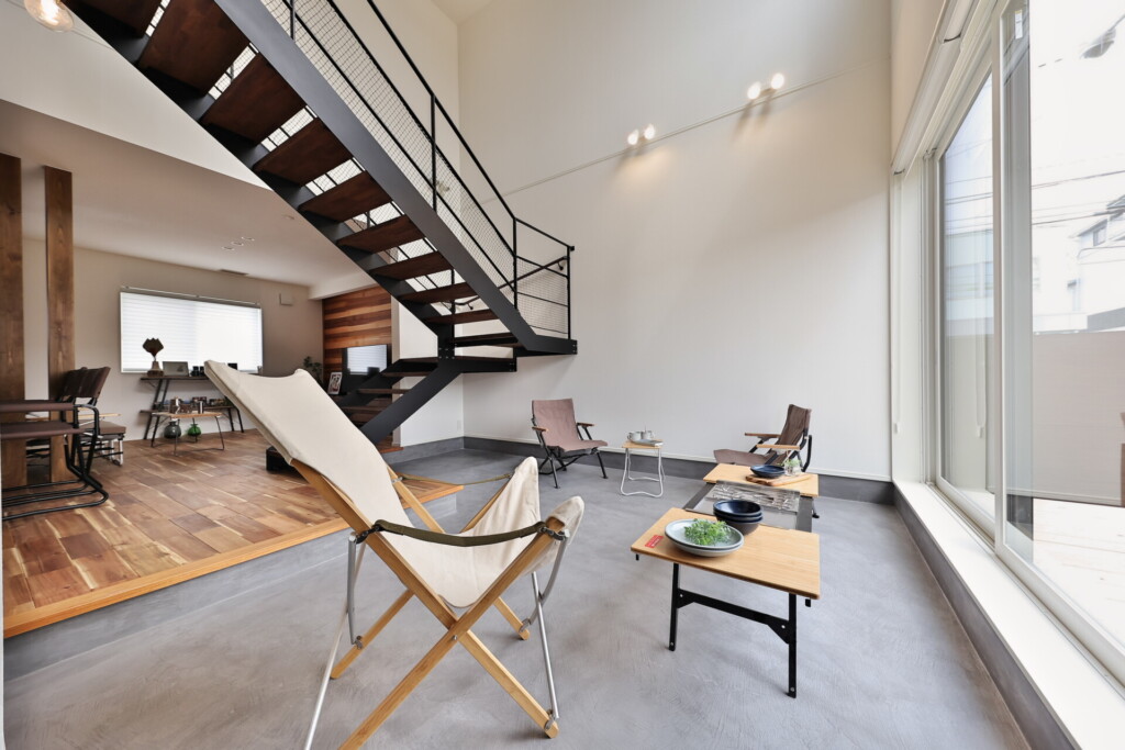 ・吹き抜け/土間スペース/土間収納/アイアン階段/カウンター/ランドリールーム/ファミリークローゼット/ウッドデッキ