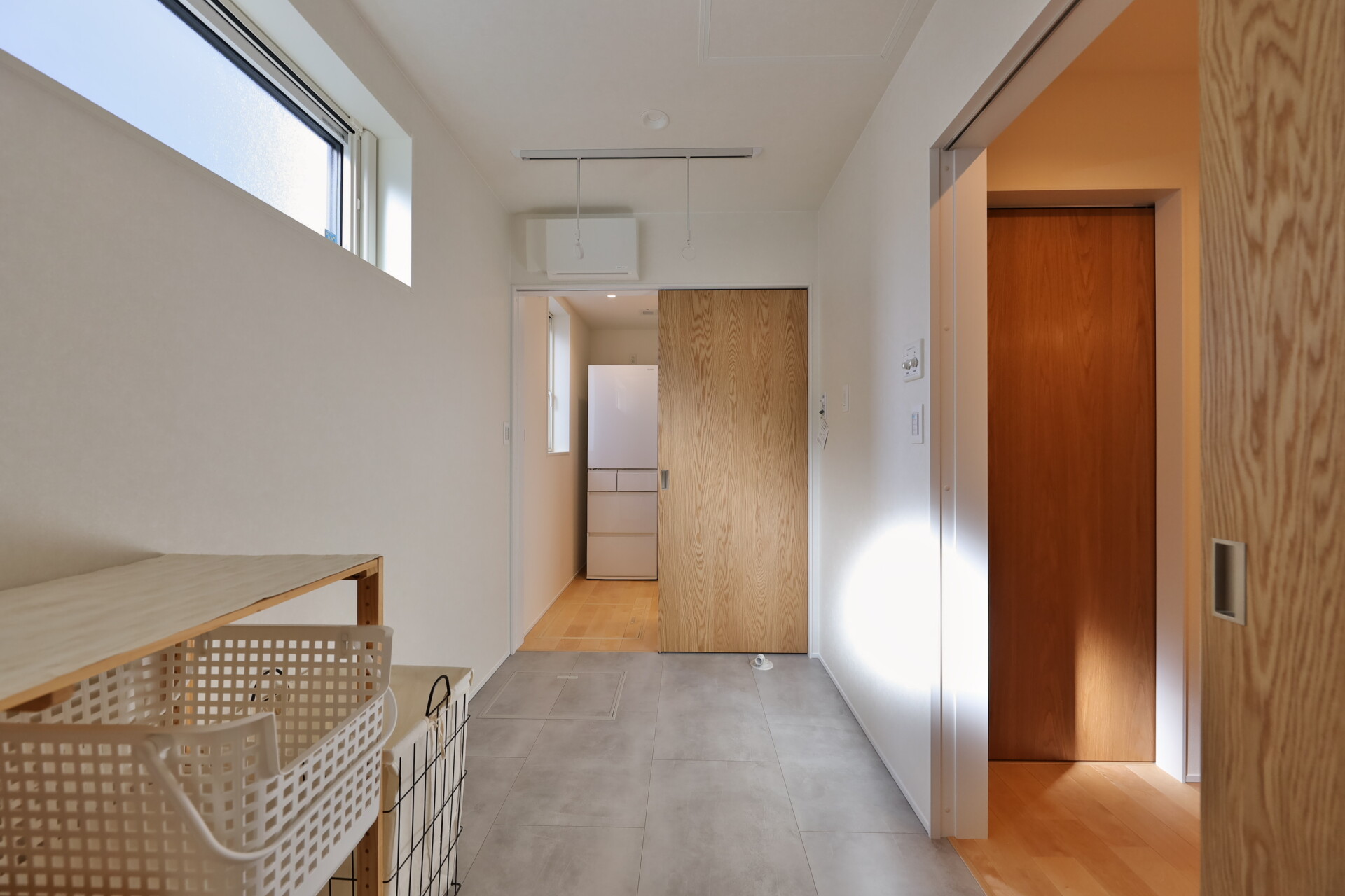 家族が帰宅後すぐに手洗いできるよう、玄関のそばにコンパクトな洗面台を設けました。