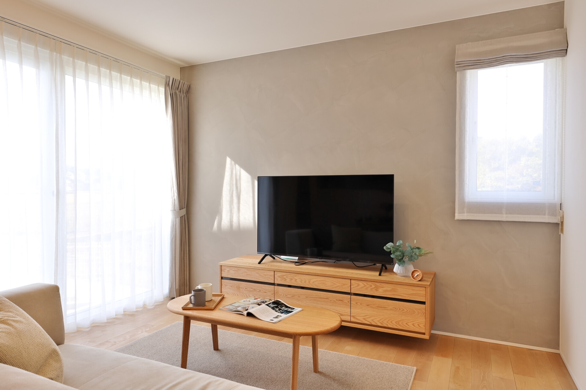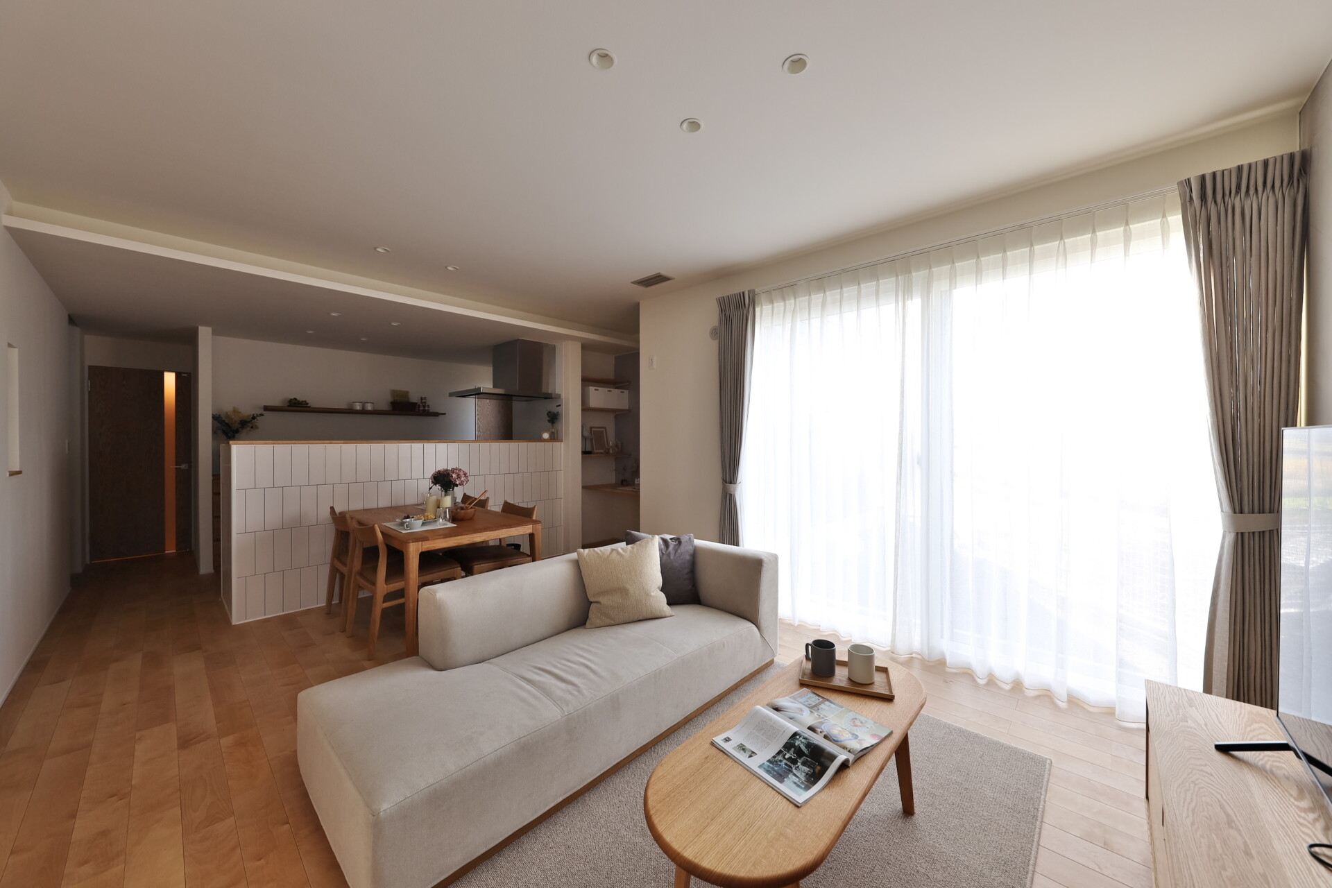 無垢床やナチュラルカラーの家具、コーブ照明などを取り入れた、柔らかい印象のLDK。