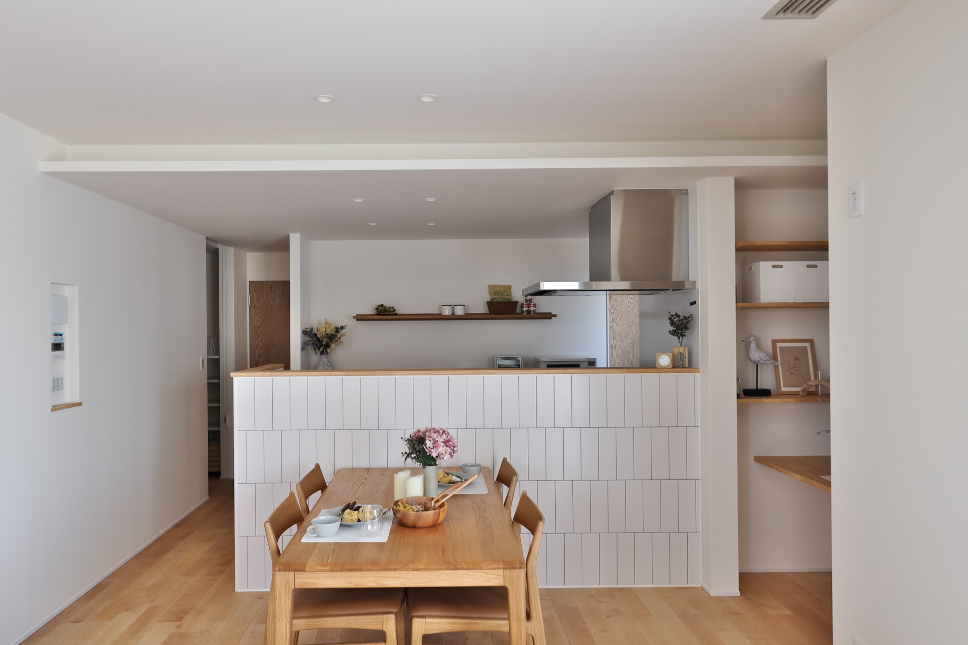 また、キッチンの腰壁を高めに設定していることも特徴の一つです。腰壁とは人間の腰の高さくらいまである壁のことで、手元を隠せたり水や油はねを軽減できるメリットがあります。