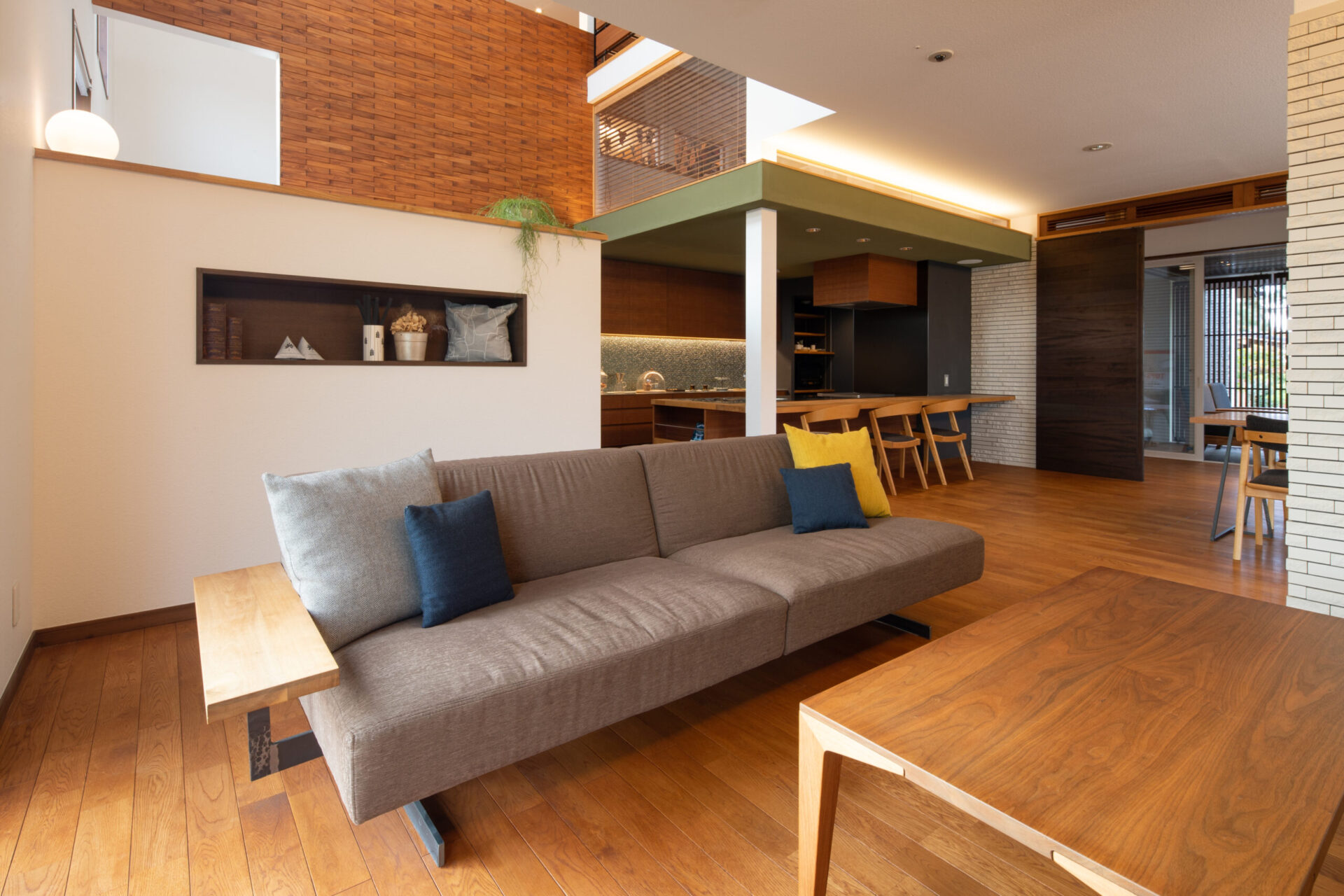 床材と下がり天井にはブラックウォールナットの羽目板を採用。