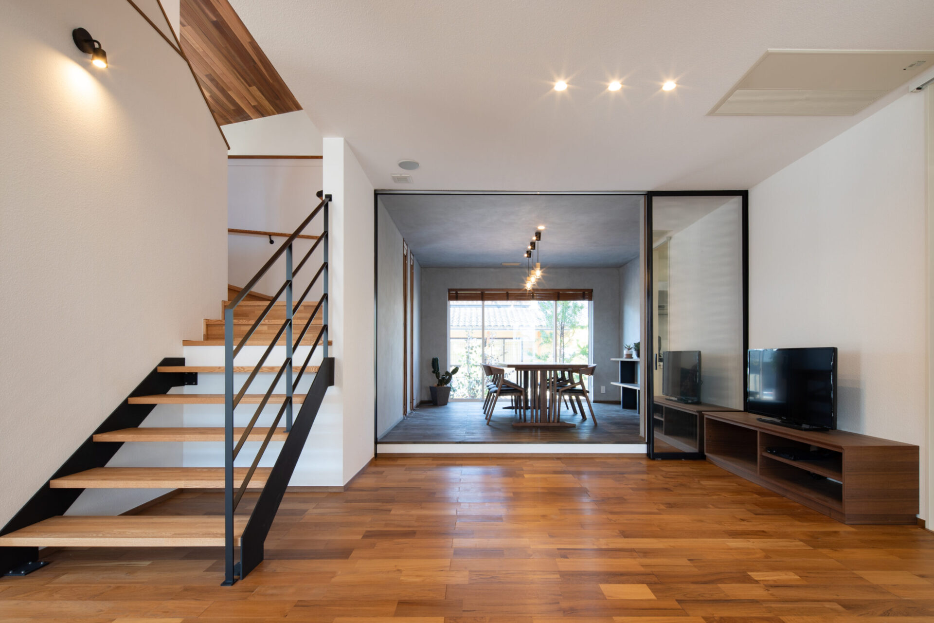 アースカラーの塗り壁とブラック塗装したアカシヤの無垢床を使いかっこいい空間ながらも素材感や木のぬくもりを感じられるように仕上げました。さらに、植物、照明、家具などのインテリアの雰囲気を合わせ、インダストリアルスタイルを演出しています。