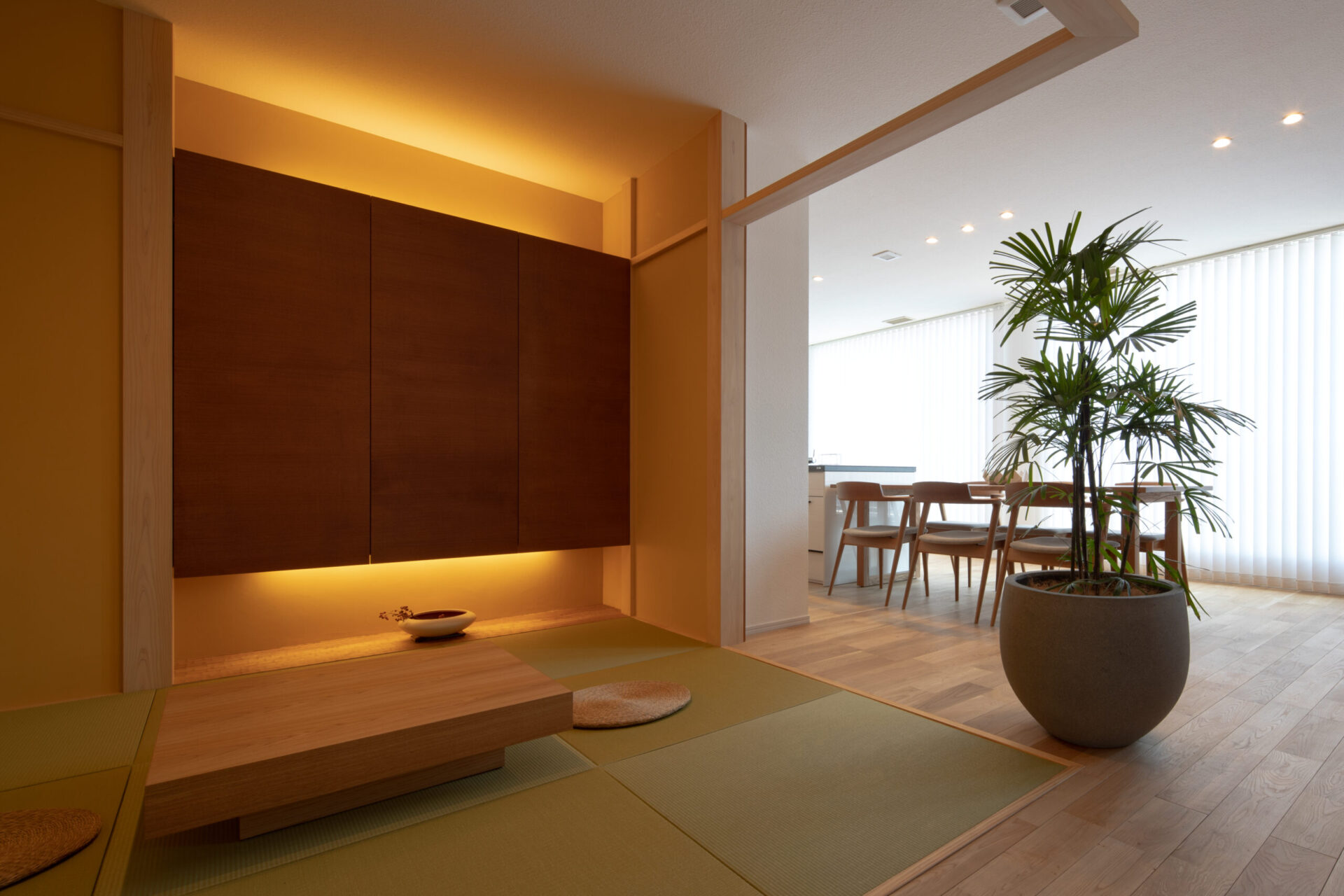 モダンスタイルの和室は、吊り鴨居により、LDKとつながっていながらも、しっかりと区切られた空間に。