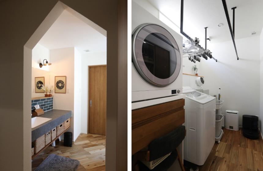 三角の垂れ壁から覗くのは、落ち着いた印象で穏やかな雰囲気が流れている洗面スペース。
