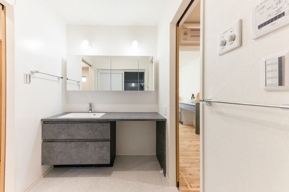 シンプルで上品な洗面台は、LDKに合わせてグレーカラーを採用。