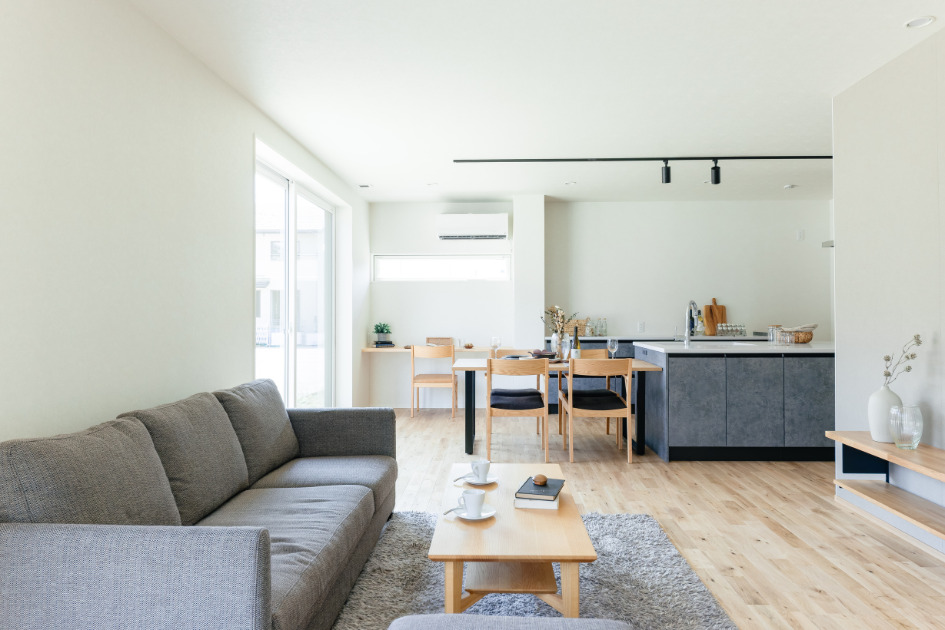 ホワイトの壁紙と優しいナラの無垢床をメインに、キッチンやテレビ背面の壁にはグレーを。