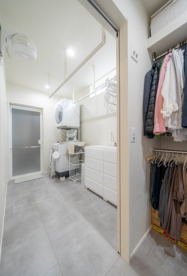 「家事動線は、リビングを通らないで済むようにしたかったので、玄関近くに水回りとファミクロをまとめました。
