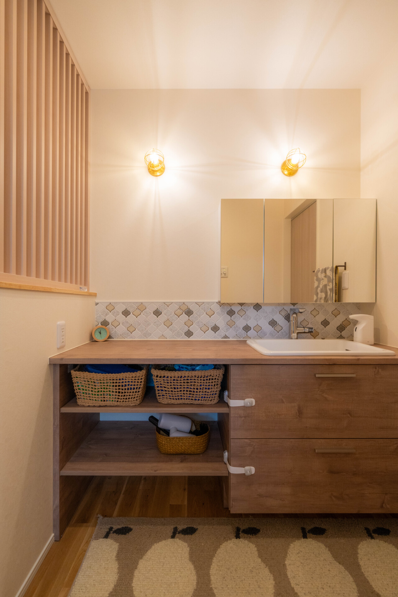 格子を空間に取り入れた、オリジナリティの光る洗面スペース