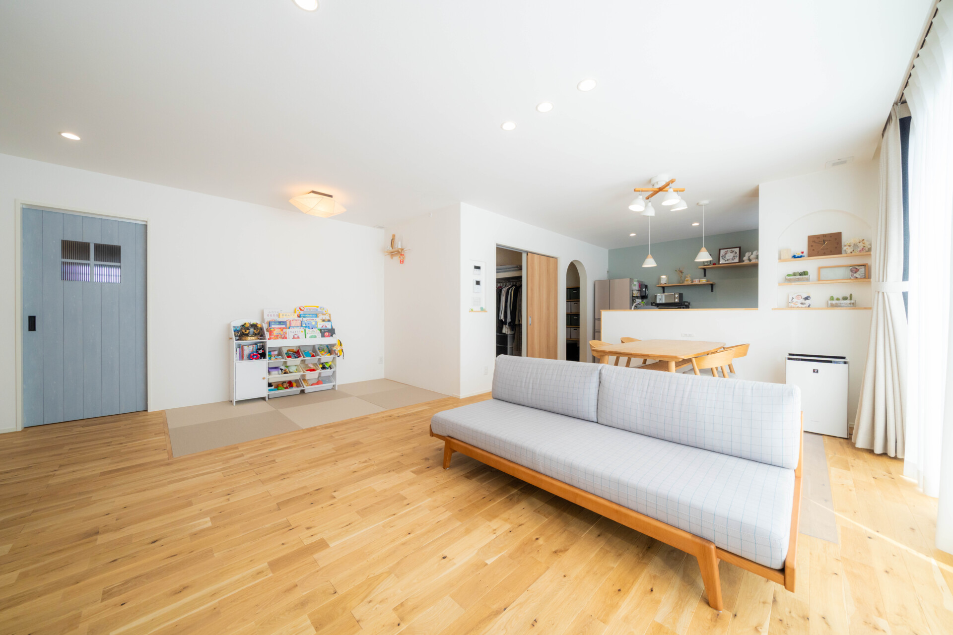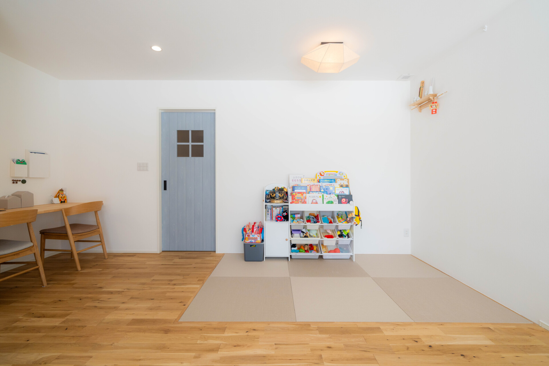 空間を明るく彩る水色のリビングドアのお隣には、お子様の遊び場として大活躍中のタタミコーナー!