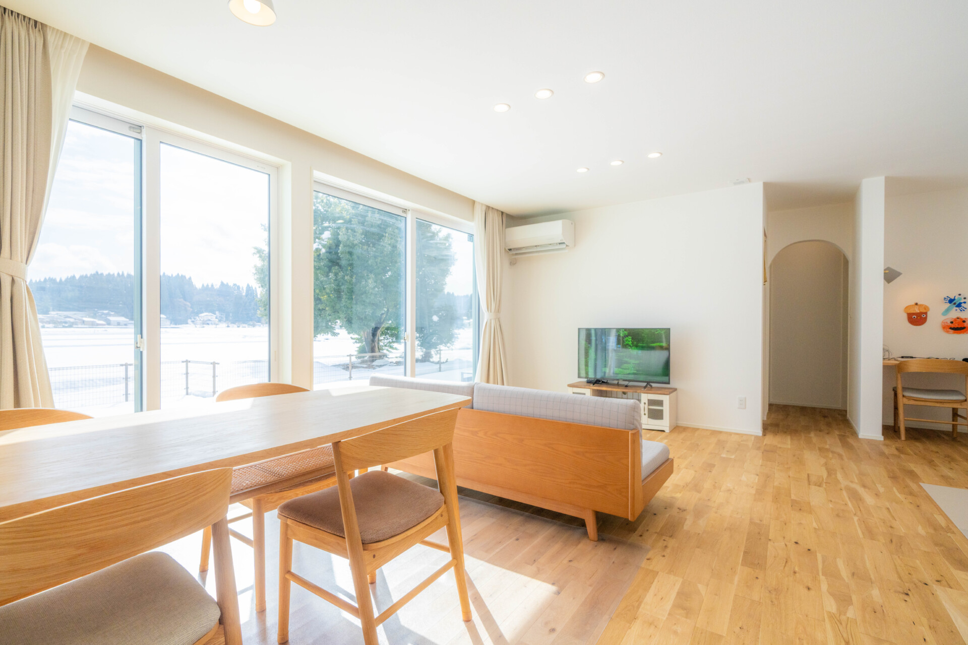 4.5メートルの大開口からは、開放的な田園風景が広がっています。この開放感を実現しながらも、独自のTOPS-W工法とトリプルガラスの採用により、北陸の夏も冬もエアコン1台で快適な住環境を維持することが可能に。