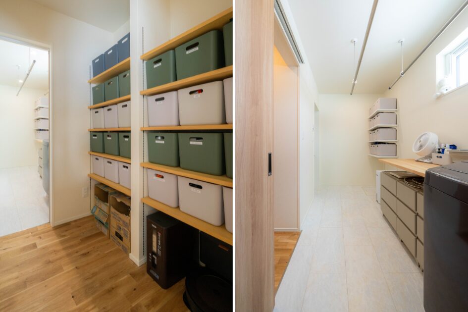キッチン→パントリー→ランドリールーム→ファミリークローゼット→LDKにアクセスできる回遊動線。